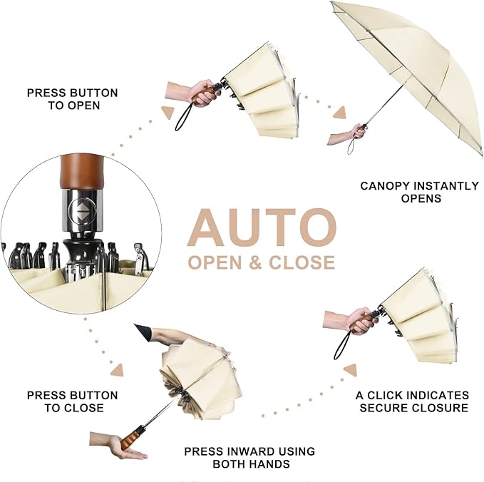 - Quick Auto Open And Close and Luxury Wooden Handle: Our umbrella portable windproof compact have a fully automated system, perfect for one hand operation. This inverted umbrella automatic open close at the touch of the button. Also, the ergonomic real wood handle with finger-notches makes it comfortable to hold and easy to grip.A large windproof golf/travel/business umbrella for you