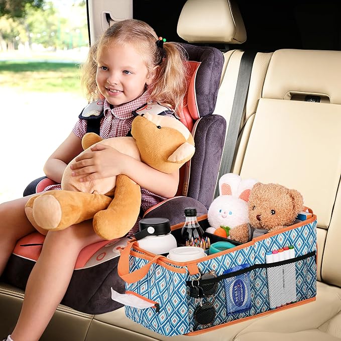 - MORE DESIGN OPTIONS: HEYSKAY offers More designs for choice so that you can select the one you like to pretty up your car as well. And our sturdy and widened handle strap makes it more comfortable to lift and does not feel hand pain--Easy to move this car console organizer from car to car or from back seat to front seat. Great travel gear for both kids and adults