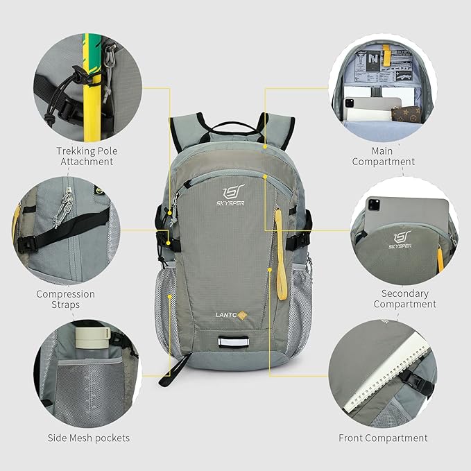 - UNIQUE APPEARANCE AND SAFETY DESIGN: The small hiking backpack features multiple compartments and an anti-theft zipper to prevent important documents and items from being stolen. The small daypack comes with an outdoor emergency rescue guide providing additional safety information for lovers of the outdoors. The LANTC20 backpack is the perfect combination of function and fashion, with a simple and smooth design featuring yellow webbing on the front panel and contrasting embroidery