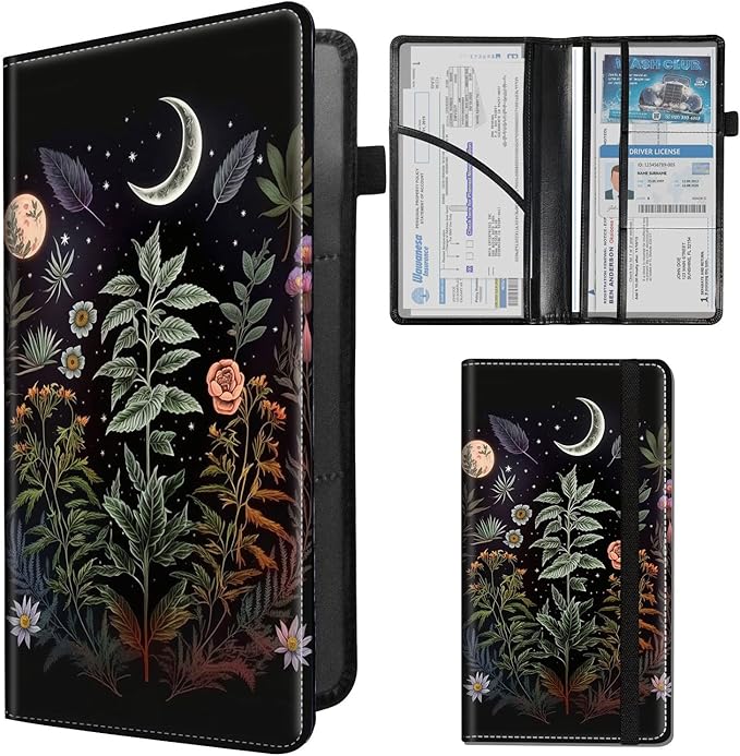 Car Registration and Insurance Holder,Leather Insurance License and Registration Card Holder for Car Glove Box, Auto Truck Document Holder Organizer for Men Women-Flowers Plants Moon Night