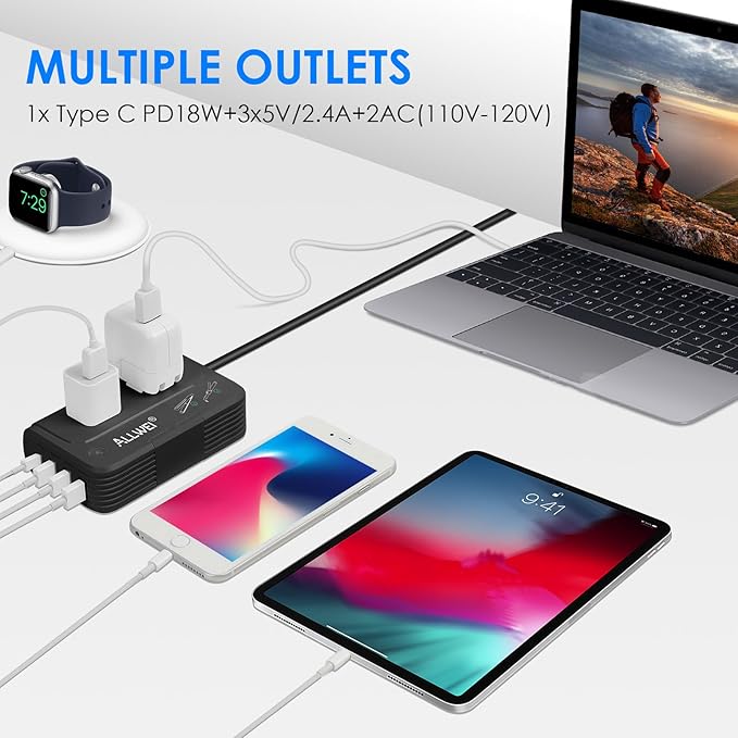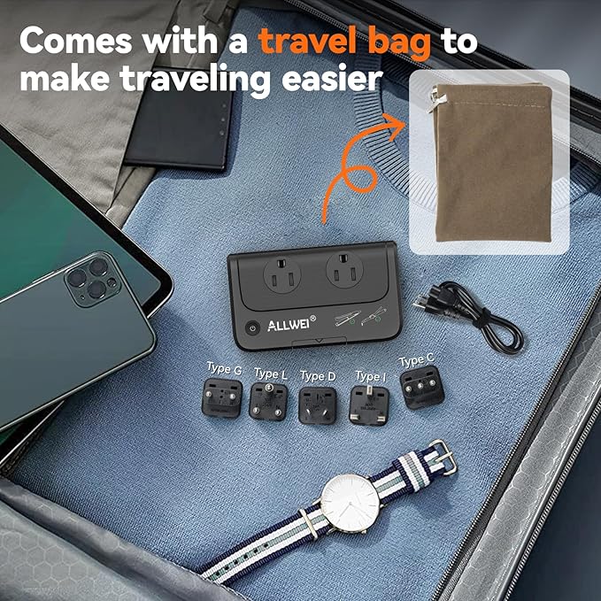 - ✈【WHAT YOU GET】ALLWEI Universal Travel Adapter, Include 5 feet detachable US power cable and 5 International adapters, storage bag,user manual, 18 months warranty and 100% customer service.