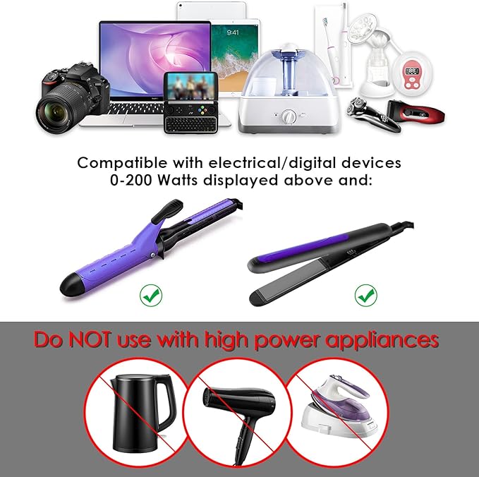 - ✈【Patented product with Patent number: US10270355B1, it has New Feature: This upgraded version WORKS PERFECTLY for Hair Straightener and Hair Curling Iron】The International Travel Adapter can work with appliances under 200 Watt such as Electrical shaver/hair cutter, Electrical toothbrush, fan, nebulizer, game console, Kindle, Laptop, Mobile phones, etc.