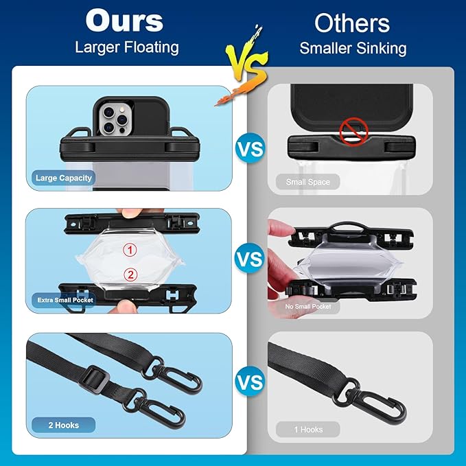 - Double Hook & Adjustable Lanyard: Waterproof bag with two hook, it's more strong and sturdy safe than single hook; the lanyard of waterproof bag is adjustable & comfortable, Max.length is 32.2 inch Min.length is 17inch, it can wearing it around neck, strap extended also can used as cross-body bag or shoulder bag; waterproof bag comes with a lanyard for easy carrying and in case it accidentally slips from your hands