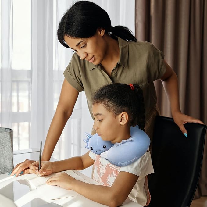 Niuniu Daddy Blue Axolotl Kids Travel Pillow Road Trip Essentials for 3-8 Y/O, Soft Memory Foam Kids Neck Pillow for Airplane Car Travel Portable Cervical Pillow with Boys Girls for Long Trip