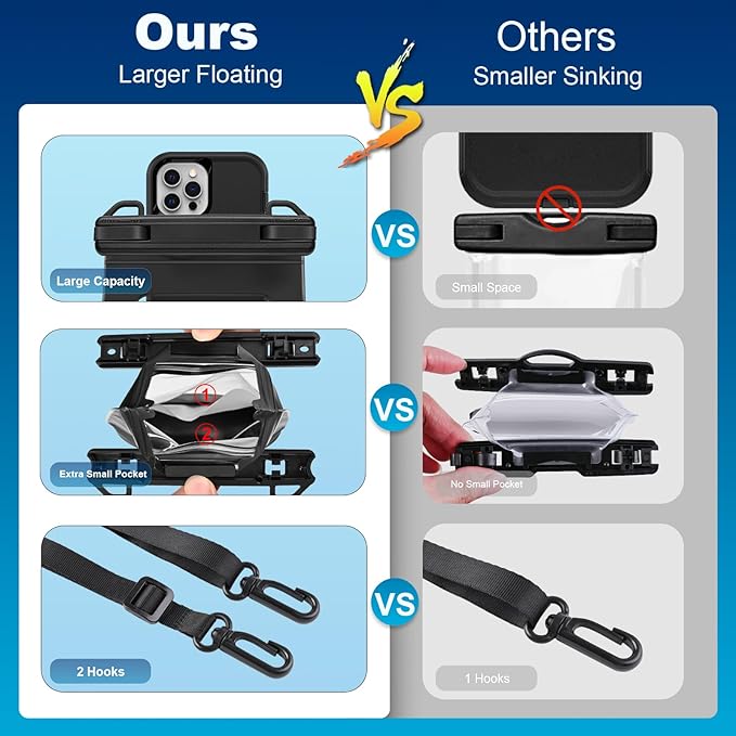 - Double Hook & Adjustable Lanyard: Waterproof bag with two hook, it's more strong and sturdy safe than single hook; the lanyard of waterproof bag is adjustable & comfortable, Max.length is 32.2 inch Min.length is 17inch, it can wearing it around neck, strap extended also can used as cross-body bag or shoulder bag; waterproof bag comes with a lanyard for easy carrying and in case it accidentally slips from your hands.