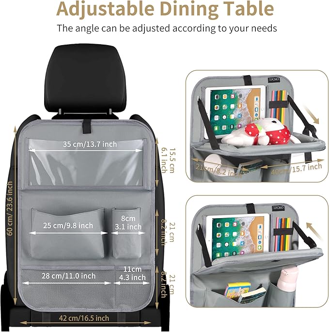 LUCMO Car Backseat Organizer with Tablet Holder,6 Storage Pockets Car Storage Organizer with Foldable Food Tray,Protectors Kick Mats Travel Accessories-Grey