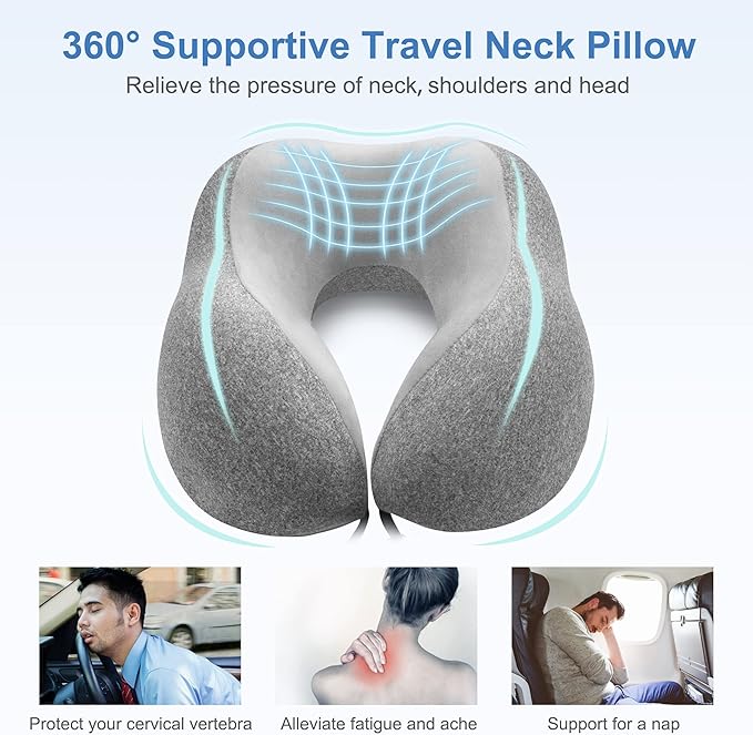 Travel Pillow - Memory Foam Cervical Neck Pillow for Adults, Kids, Children, Convenient & Portable U Shaped Pillows, Airplane Pillow for Home, Office, Camping, Travelling, Sleeping (Gray)