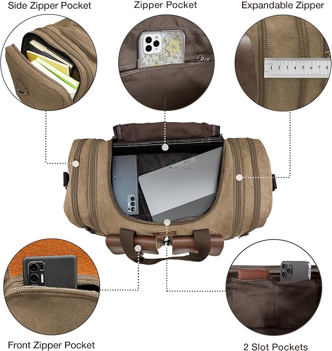 Wildroad 60L Travel Duffel Bag, Expandable Canvas Genuine Leather Duffle Bag Upgraded Overnight Weekender Bag Carry on Bag (Coffee, X Large-60L)