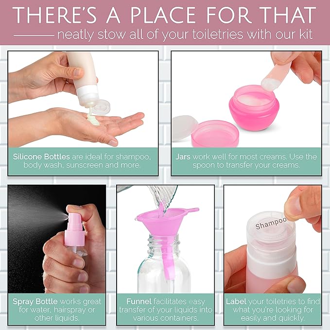 Travel Size Toiletry Bottles, Kit of 16 - TSA Approved Toiletries Essentials for Flying - Must Haves for Women - Silicone Containers, Squeeze Bottles and Accessories for Shampoo, Conditioner, Liquids