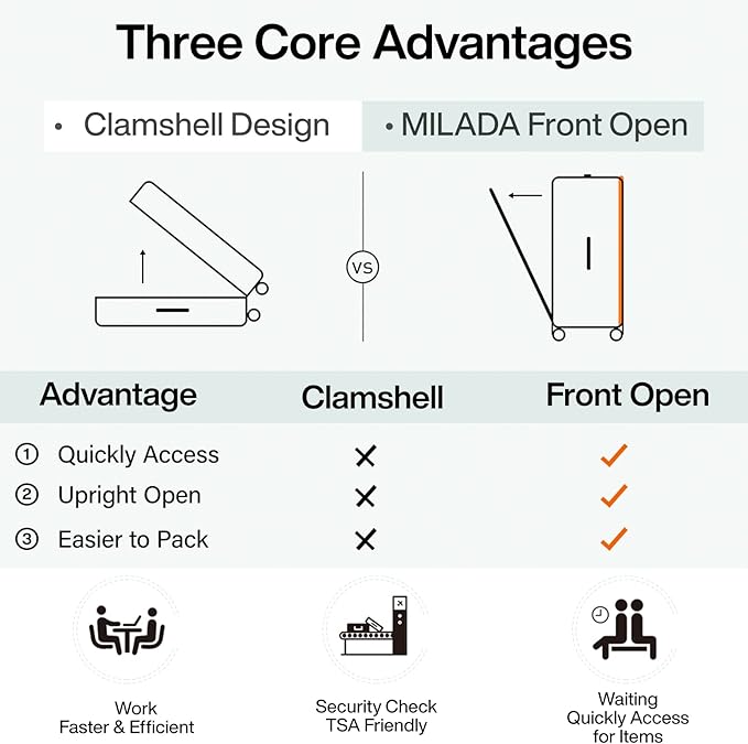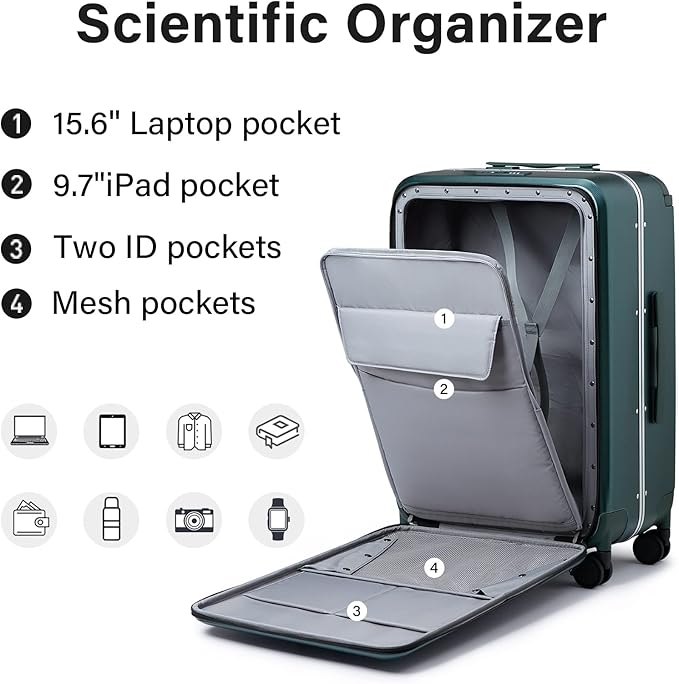 - 【Fastly Opening Front Compartment】Our wide handle checked luggage with front pocket choice hard side feature with a front compartment for 15.6" laptop, so it would be easier to go through security at the airport. And you can zipper it open quickly to get your laptop or electronics in and out at any time and where