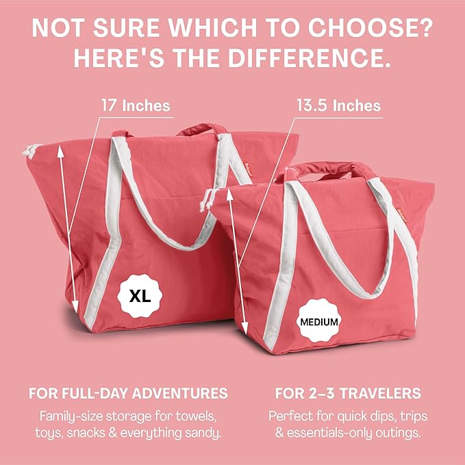 - OVERSIZED BEACH BAG: Measuring 17 x 25 x 10 inches, this extra large beach bag fits 4-5 towels, sunscreen & more - best for family use. Spacious yet easy to carry with 2 padded handles—short for hand-carry, long for shoulder use