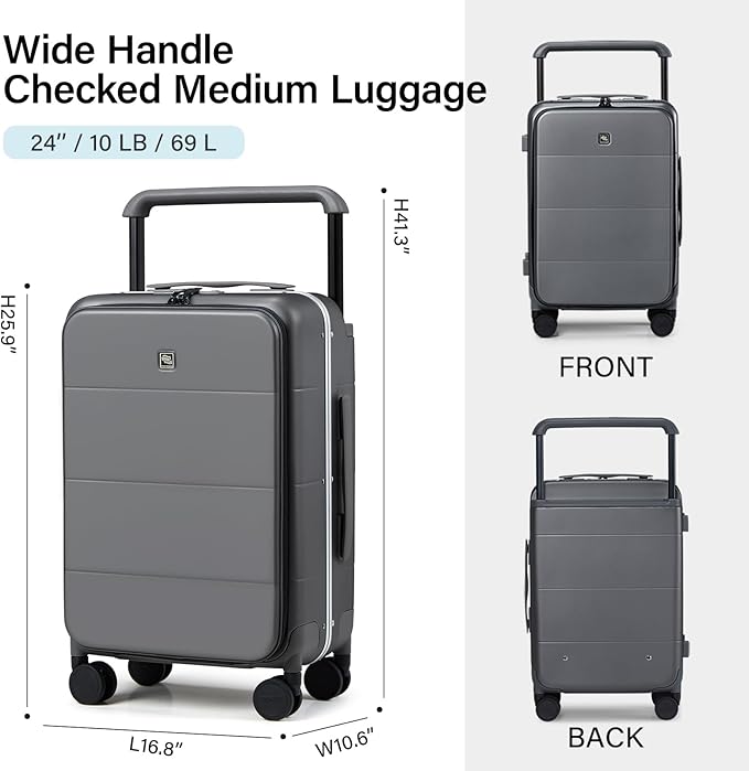 - 24 Inch Luggage Overall Dimension: including wheels and handles - 25.9” x 16.8” x 10.6”, Internal Dimensions - 23.9” x 16.7” x 10.6”, weight at just 10 lbs. Packing Capacity: 69L. Ideal as an medium suitcase for family trips or business travel