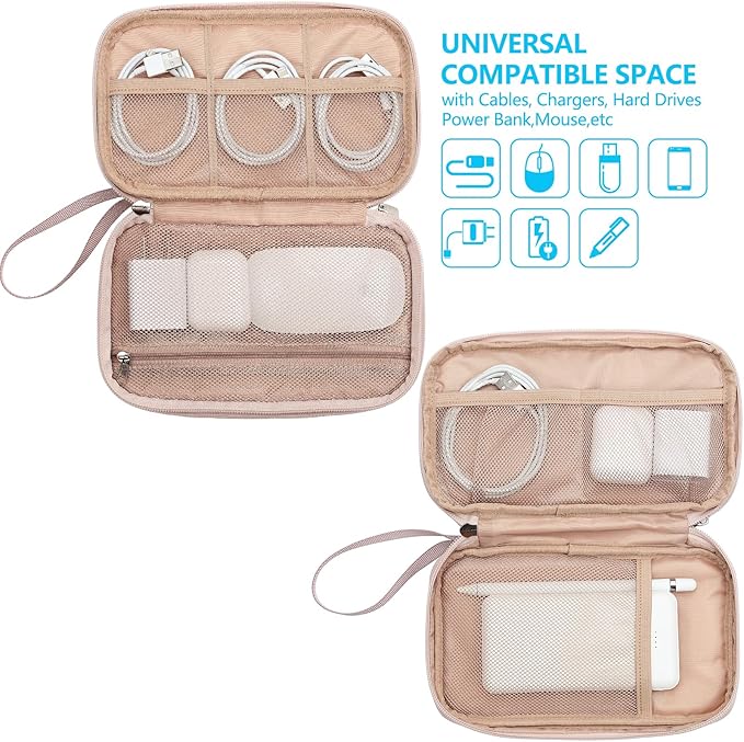NISHEL Travel Cord Organizer Case, Double Layers Tech Electronic Bag, Essentials for Charger, Cable, Phone, Flash drive, Medium, Pink