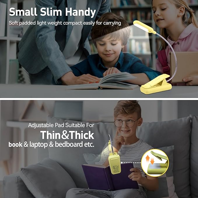 - 【7 Led & 9 Color Temperature】This new pretty yellow book light is perfect for everyone which can increase their reading enthusiasm. Meantime, parents will also love the book lights when working, reading or accompany their kids. The reading light is equipped with 7 upgraded smd leds, 9 different color temperature modes: warm white(2800k/3000k/3200k), warm cool white(4000k/4500k/5000k) and cool white(6000k/6500k/7000k)
