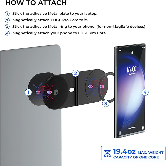 - Universal Compatibility - Compatible with MagSafe and Non-MagSafe Devices Edge Pro Core works with Apple MagSafe devices and Qi-enabled phones. Non-MagSafe devices can be easily attached using the included adhesive metal rings for a secure fit, making it versatile for both older and newer smartphones. EDGE Pro Core is as thin as 2 credit cards when in use. With a minimum thickness of just 2.5mm, EDGE Pro Core is the perfect companion for leisure or remote working.
