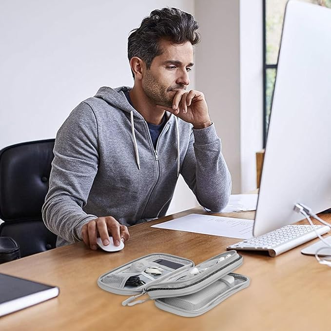 - Dimensions: The Size of the travel organizer case is 7.5"(L) x 4.3"(W) x 2.2"(H). The big 3-compartment pocket inside can store mobile phones or power banks, and other small grid compartments can store small items such as cables or headphones