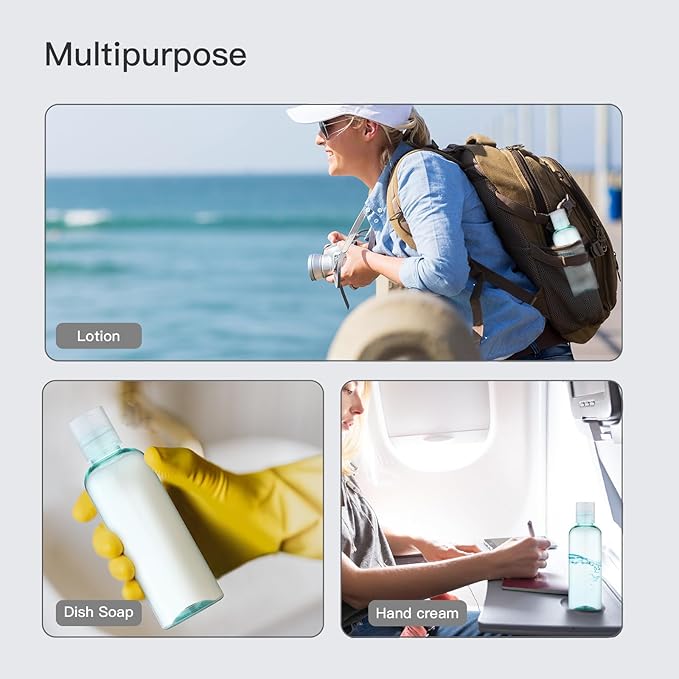 - Compact & Portable Travel Size Toiletries - These mini bottles are incredibly portable and cute, fitting easily into your bag, pocket, or gym bag. Their tiny travel containers make them ideal for traveling, camping, or keeping essentials handy wherever you go. The squeeze PET material ensures easy dispensing of your shower gel, shampoo, lotion, and other liquids.