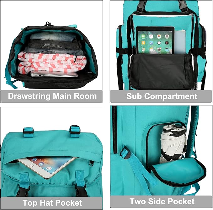 - 【Hiking Backpack Structure】: The 70L camping backpack main compartment is drawstring closed, hiking backpack roomy enough for you storage hiking gear, shoes and luggage, 1 laptop compartment, 1 front zipper pocket and 2 side pocket for separate and orderly storage.
