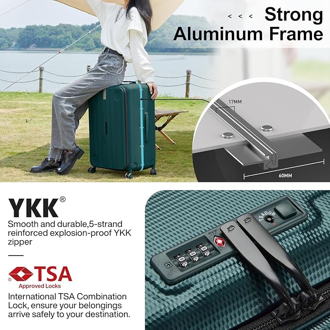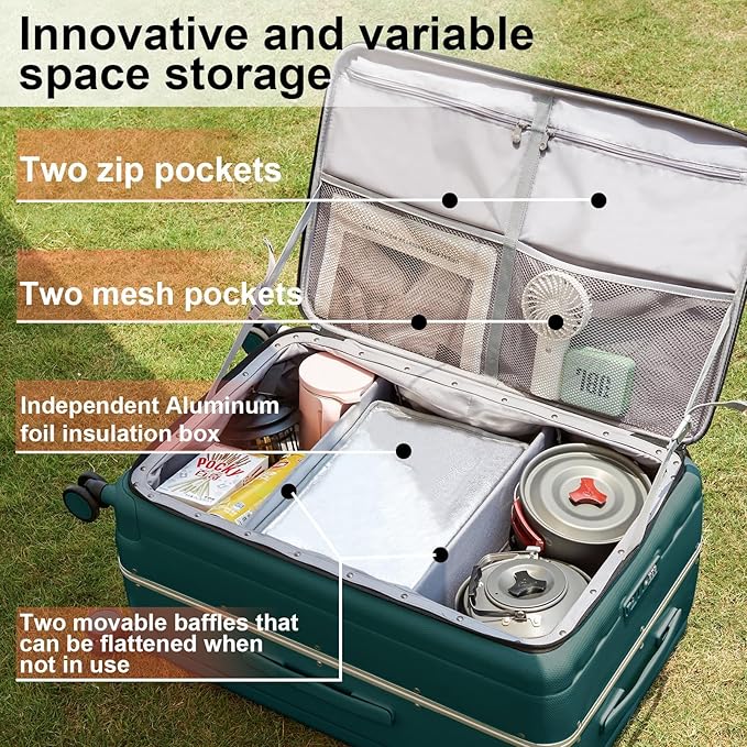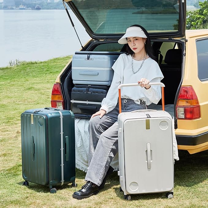 - 【CREATIVE FRONT OPENING】The trunk luggage with spinner wheels Leading the future opening and closing method which is effortless to open or close the suitcase, not only is it easy to load, but it also saves space. This design solves the problem that traditional luggage separated 2 compartments of heavy load then it's difficult to open and close. Importantly, it also avoid the displacement of items.