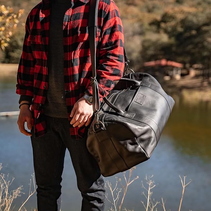 Full Grain Leather Duffle Bag – 40L Travel, Gym & Carry-On Weekender for Men | Handcrafted Overnight Bag with Brass Hardware, Black Style