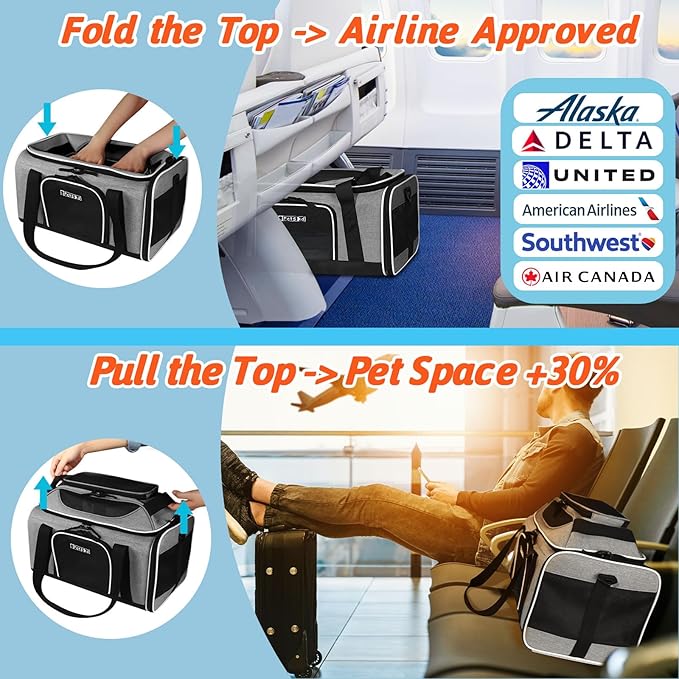 Petskd Top-Expandable Pet Carrier 17x11x9.5 Inches Alaska Airline Approved, Soft-Sided Carrier for Small Cats and Dogs with Locking Safety Zippers and Anti-Scratch Mesh(Grey)