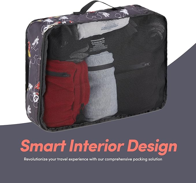 - Complete 5-Piece Organizer Set: Master packing with these luggage bags for travel: large compression cube (13" x 18" x 5.5") for clothes, medium organizer (12" x 16" x 5.5") for essentials, small packaging cube (11" x 13" x 5.5") for accessories, and flat pouch (6" x 10") for documents. Featuring Disney-themed accents and mesh panels for visibility. Perfect for organizing any suitcase or carry-on, these travel bags organizer for luggage include convenient handles and durable zippers.