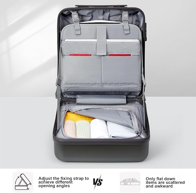 - 【Multiple Compartment】This luggage carry on with spacious main compartments and enclosed zipper compartment for clothes, then a mesh pocket on it. Features a padded laptop compartment that fits laptop up to 14 inches and 2 slot pockets.