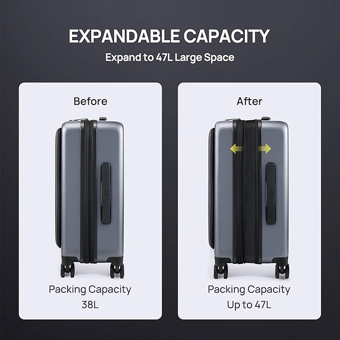 - 【Lightweight & Expandable】Weighing just 8.1 lbs with dimensions of 22.01" x 14.57" x 9.84" (including wheels), this carry-on meets most airline size restrictions. The expandable construction offers up to 24% additional packing capacity (47L maximum) while maintaining compliance with overhead bin storage requirements.