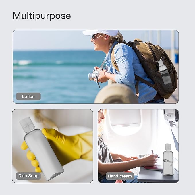 - Leakproof & Reusable Travel Containers - Say goodbye to messy spills with these empty travel size bottles featuring a reliable disc top cap and screw top travel bottles design. Crafted from durable plastic that's easy to squeeze, these reusable travel bottles for toiletries are leakproof, BPA free, and designed for repeated use. Each travel kit bottles comes with both handwritten and printed labels for easy identification of your travel lotion container, travel size shampoo and conditioner bottles, and more.