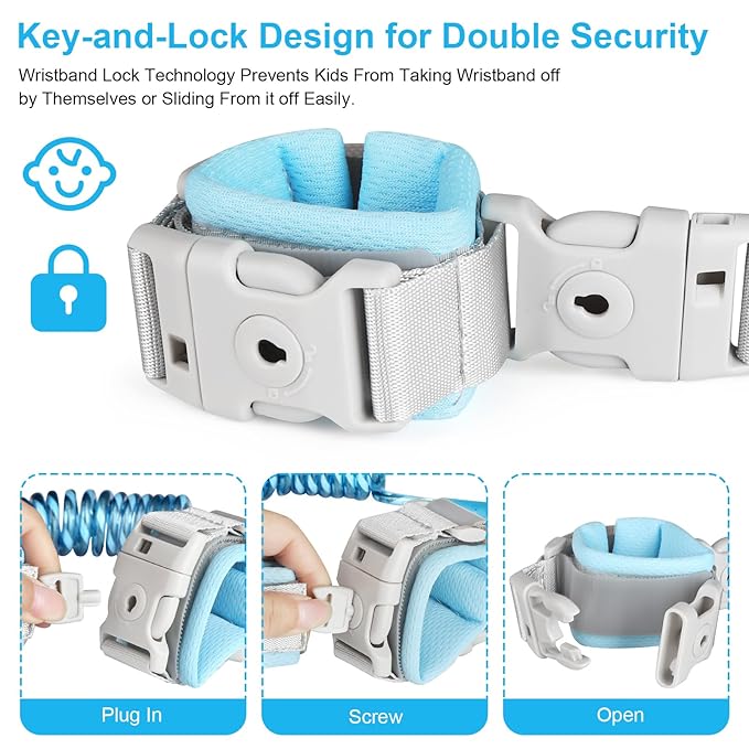 - Key-lock Design and Stainless-Steel Material: The anti-lost link is made from anti-cut stainless steel materials. Its surface includes PU materials which won’t be cut unless special tools are used, and it can stretch up to 6.56 ft, 360° swivel head allows your child to play and run freely without worrying that your child will be tripped