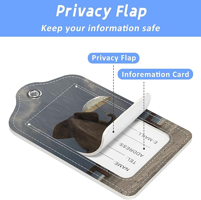 Elephant and Dog Sit Under The Rain Luggage Tags 2PCS PU Leather Suitcases Tag with Stainless Steel Loop and Privacy Name Address Cover Label Card for Women Men Travel