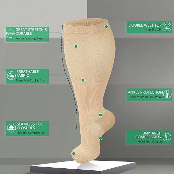 - 【COMPRESSION THERAPY PROMOTES HEALTH】- Our Plus Size compression socks with graduated pressure effectively promote smooth flow of blood vessels from the distal end to the proximal end. More improve blood circulation and oxygen flow means more healthier legs and less pain and swelling. Our Graduated Compression Stockings support your legs, reduce fatigue, soreness, and prevent injuries, cramping, swelling and help in muscle recovery and varicose veins.