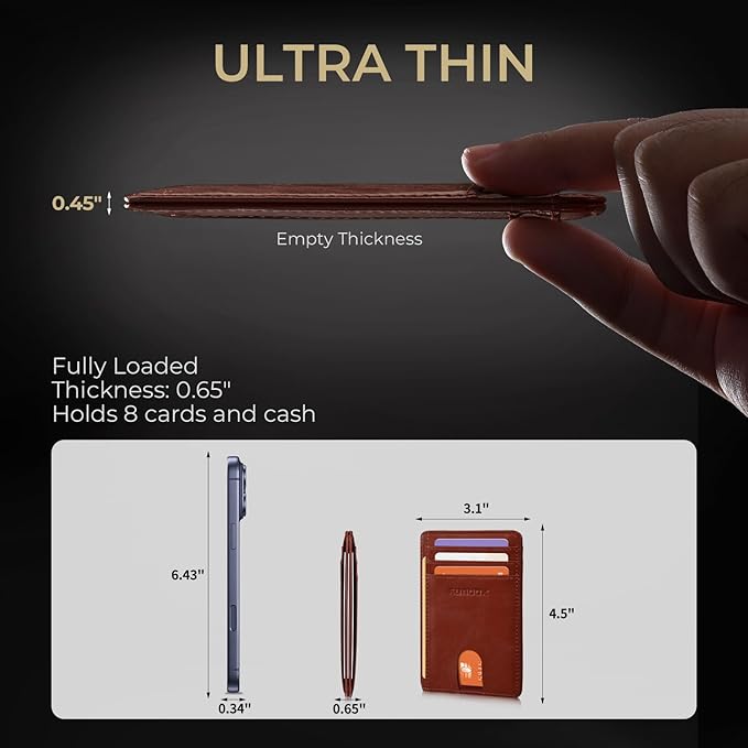 - STYLISHLY SMALL, SLIM and DISCREET: Measuring just 4.5"x 3.1"x0.45", our RFID front pocket slim wallet is super thin and modernly slim. It's the minimalist wallet that fits perfectly in your pocket, purse or travel pack