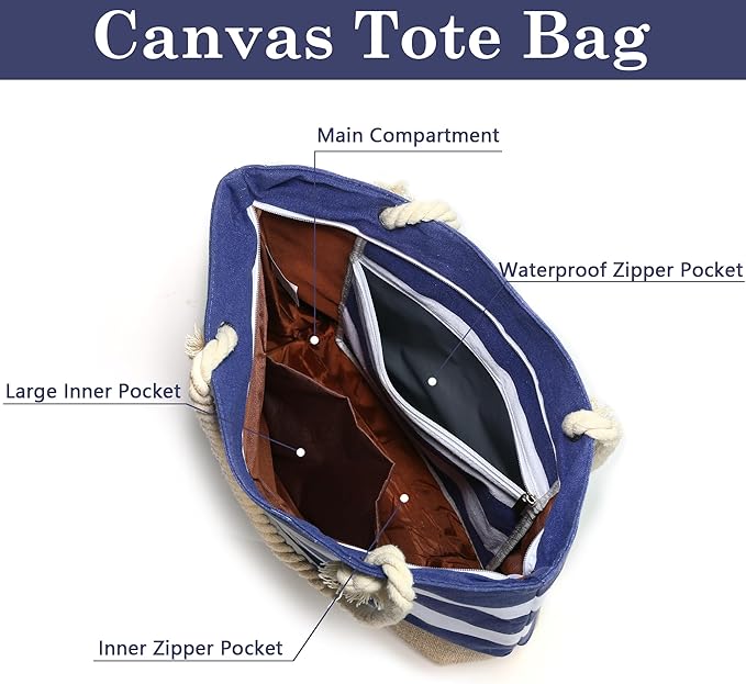 - 【Multi Pockets Design】The canvas beach tote bag is designed with 1 main compartment and 3 small pockets on the inside, one of which is a zipped pocket and a extra pocket, suitable for keys, mobile phones, wallets and other small valuables. On the other side, there is an independent wet bag, which is made of laminated special material and waterproof, which can easily separate wet and dry items to protect your valuables