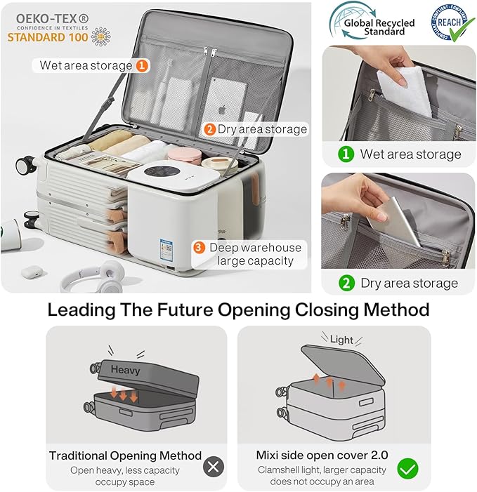 - 【One-Piece Side Opening Design】The design is different from the traditional way of opening and closing the suitcase in half, which is more convenient and less labor-saving. Mixi patent design, focus on luggage industry over 10 years, please believe Mixi brand power