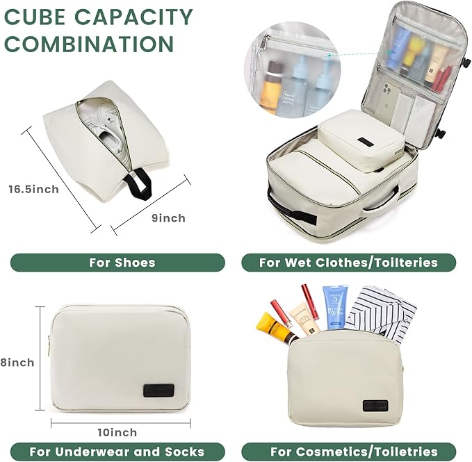 - 👔【WELL-DESIGNED COMPARTMENTS】This travel backpack has 4 main compartments and 3 packing cubes supplied, which enable you to keep your things in order. Your shoes, toiletries, and underwear can be placed in separate packing cubes. There is also a side pocket for bottles and umbrellas. A separate dry and wet compartment allows you to store wet towels and toiletries.