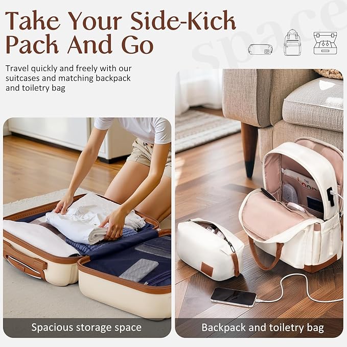 - Five piece set offers a 20’’ luggage, a 24’’ luggage, a 28’’ luggage, a weekender travel bag and a toiletry bag. Three piece sets offer two options. Option A includes a 20’’ luggage, a travel duffel bag and a toiletry bag. Option B includes a 20’’ luggage, a backpack and a toiletry bag