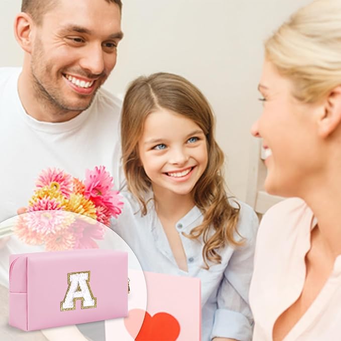Personalized Initial A-Z Preppy Patch Makeup Bag,Small PU Chenille Letter Cosmetic Bag with Zipper for Teen Girls,Pink Cute Toiletry Organizer Bag,Monogram Makeup Case Gift for Women Girls,Letter A