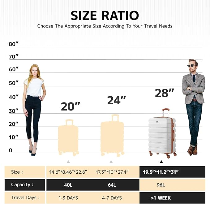 - [Checked-Large 28 Inch] The 28-inch suitcase meets the functions of boarding, travel, and daily storage. Size: 19.5*11.2*31 inches. Capacity: 96L.