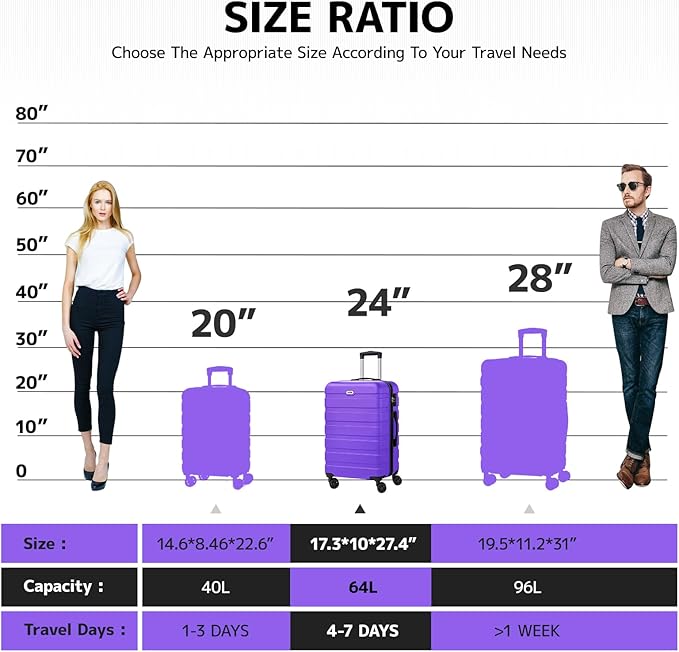 - [Checked-Medium 24 Inch] The 24-inch suitcase meets the functions of boarding, travel, and daily storage. Size: 17.3*10*27.4 inches. Capacity: 64L.