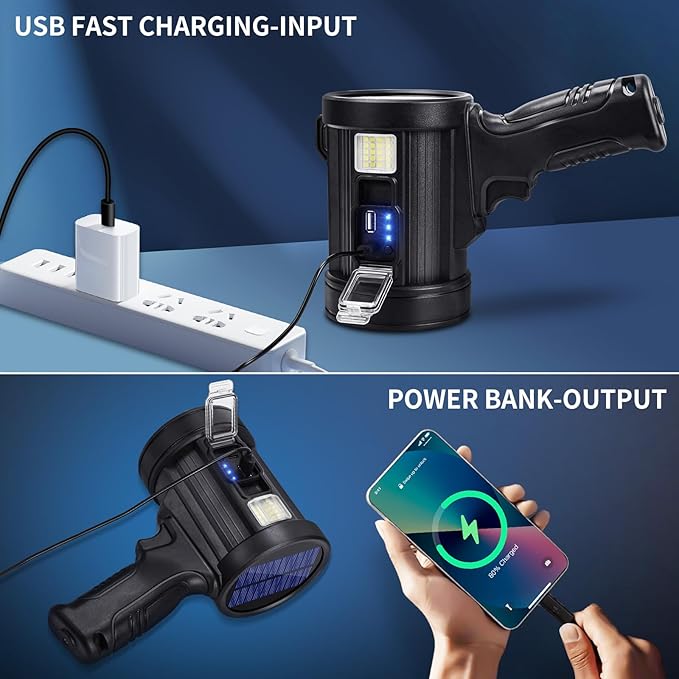 - 【2 CHARGING MODES】The bright heavy duty flashlight can be charged through a socket or a solar panel. The advantage of USB rechargeable spotlight is faster charging speed and less wear on the charging port, making it more solid. This LED spotlight flashlight features direct USB charging, eliminating the need to disassemble the spotlights. Please note that the solar charging speed depends on the intensity of light and its impact on the surface area