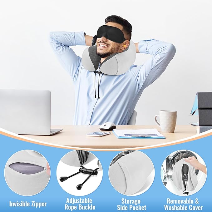 - 【Premium Memory Foam & Breathable Cover】 CloudBliss travel pillow is made of premium memory foam that is soft and supportive to fit the curve of your neck. The travel neck pillow is also covered with a layer of breathable cloth for a more comfortable rest