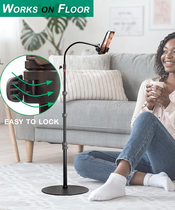 - Height Adjustable and Small Place Occupied: the height of this overhead phone holder stand can be adjusted from 19 inch to 75 inch. The heavy metal base diameter is 11 inch tall and 4.7 lbs weight, small space occupied and strong. you can use it as a floor phone overhead stand or a phone floor stand for bed.