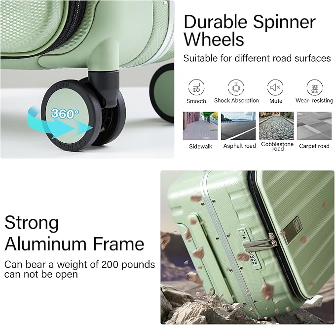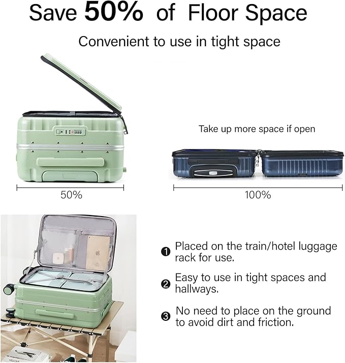 - 【CREATIVE FRONT OPENING】This trunk luggage with spinner wheels Leading the future opening and closing method which is effortless to open or close the suitcase, not only is it easy to load, but it also saves space. This design solves the problem that traditional luggage separated 2 compartments of heavy load then it's difficult to open and close. Importantly, it also avoid the displacement of items.