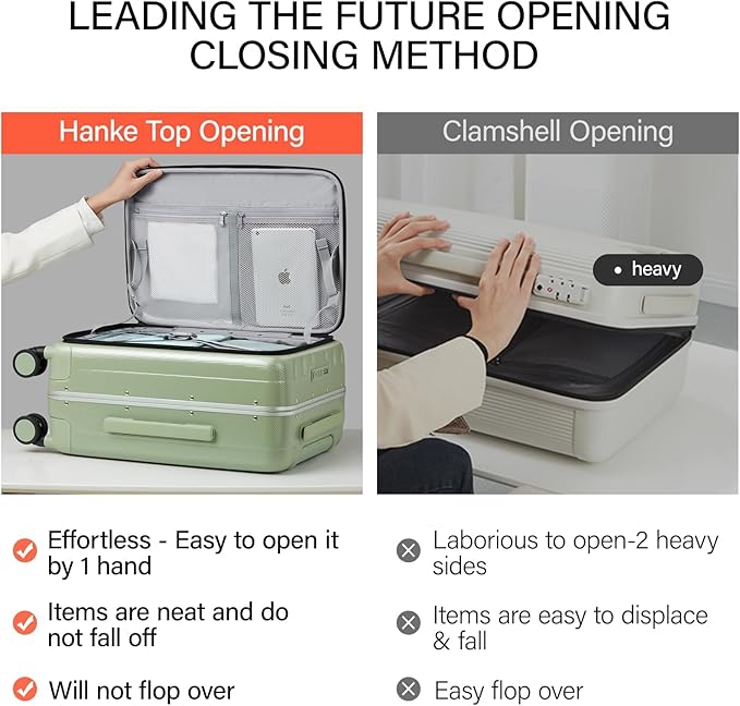 - 【CREATIVE FRONT OPENING】This trunk luggage with spinner wheels Leading the future opening and closing method which is effortless to open or close the suitcase, not only is it easy to load, but it also saves space. This design solves the problem that traditional luggage separated 2 compartments of heavy load then it's difficult to open and close. Importantly, it also avoid the displacement of items.