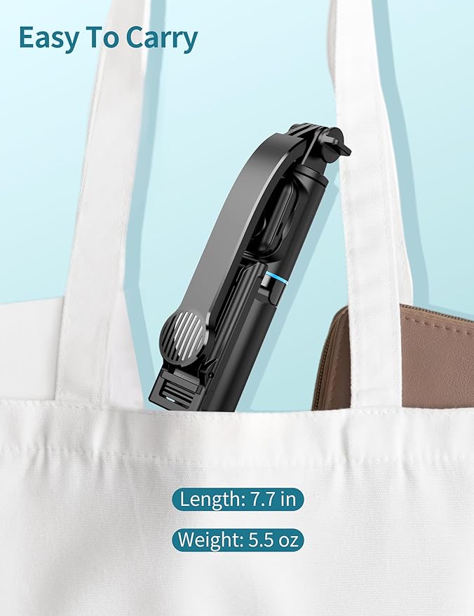 - 【Lightweight & Portable】 Selfie stick thanks to the hidden retractable design, when folded up size 7.7 inch (19.6 cm), weigh 5.5 oz (156g), it can be easily packed in your bag, backpack or suitcase without taking up more space. The phone tripod stand is easy to carry nice, which is great for traveling, hiking, camping. Whenever you want to capture a beautiful moment, it's right there.