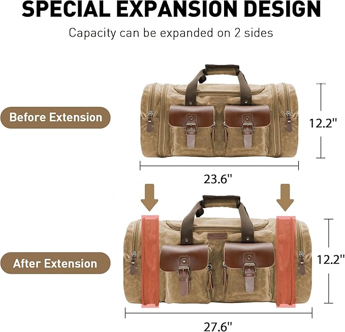 - 【Large and Expandable Capacity】You will be surprised at the size of this travel bag. Regular dimensions are (L)23.6 x (W)11 x (H)12.2 inches (50L). Extends to (L)27.6 x (W)11 x (H)12.2 inches (60L). The internal capacity is large enough to store clothes and travel essentials for 7-9 days. Can also be used as a carry-on flight bag.