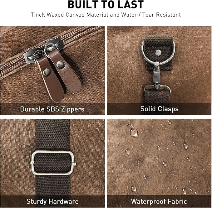- 【Vintage Style】This duffle bag is made of waterproof durable waxed canvas, high quality leather, sturdy hardware and smooth strong SBS zippers. It is retro and stylish and can be used as a handbag. Padded handle for comfortable carrying. No need to worry about quality. This overnight bag also features a large durable adjustable shoulder strap for hands-free use.