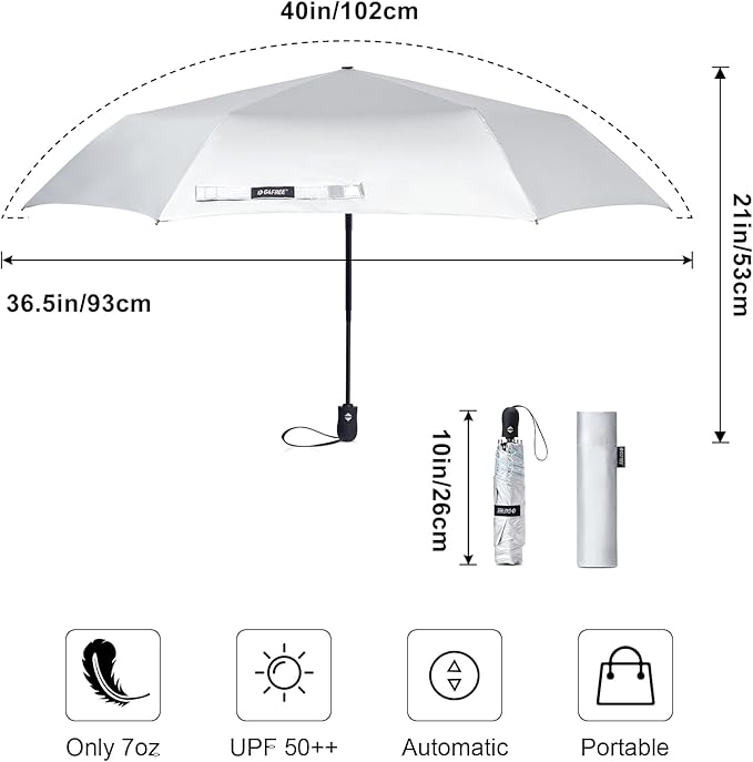 - Maximum UPF 50+ UV Protection: The upgraded 100% polyester 20D thin silver coating fabric makes it easy to fold up neatly and preserves the UV protection feature. UPF 50+ rating blocks 99% of the sun's harmful UVA and UVB, and reflects heat to lower the temperature under the SPF umbrella, keeping you cooler on sunny days