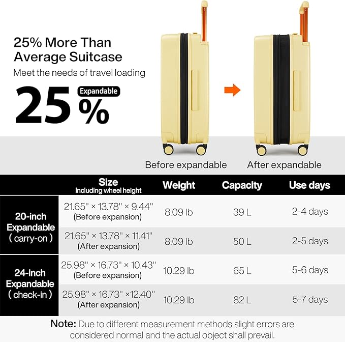 mixi Large Capacity Expandable Luggage Suitcases With Spinner Wheels,Upgrade Wide Handle PC Hardshell Rolling Travel Suitcase with TSA Lock, Checked-Medium 24-Inch, Lark Yellow